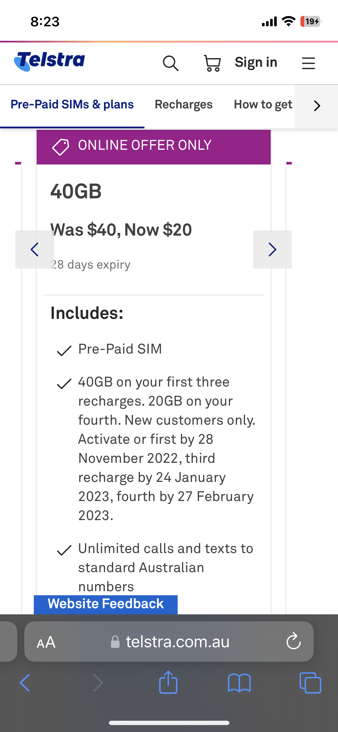 See SIM deal 클릭하면 여러 가지 딜이 나오는데, 현재 온라인에서만 제공하는 특가는 40GB에 $20불로 반값이다!