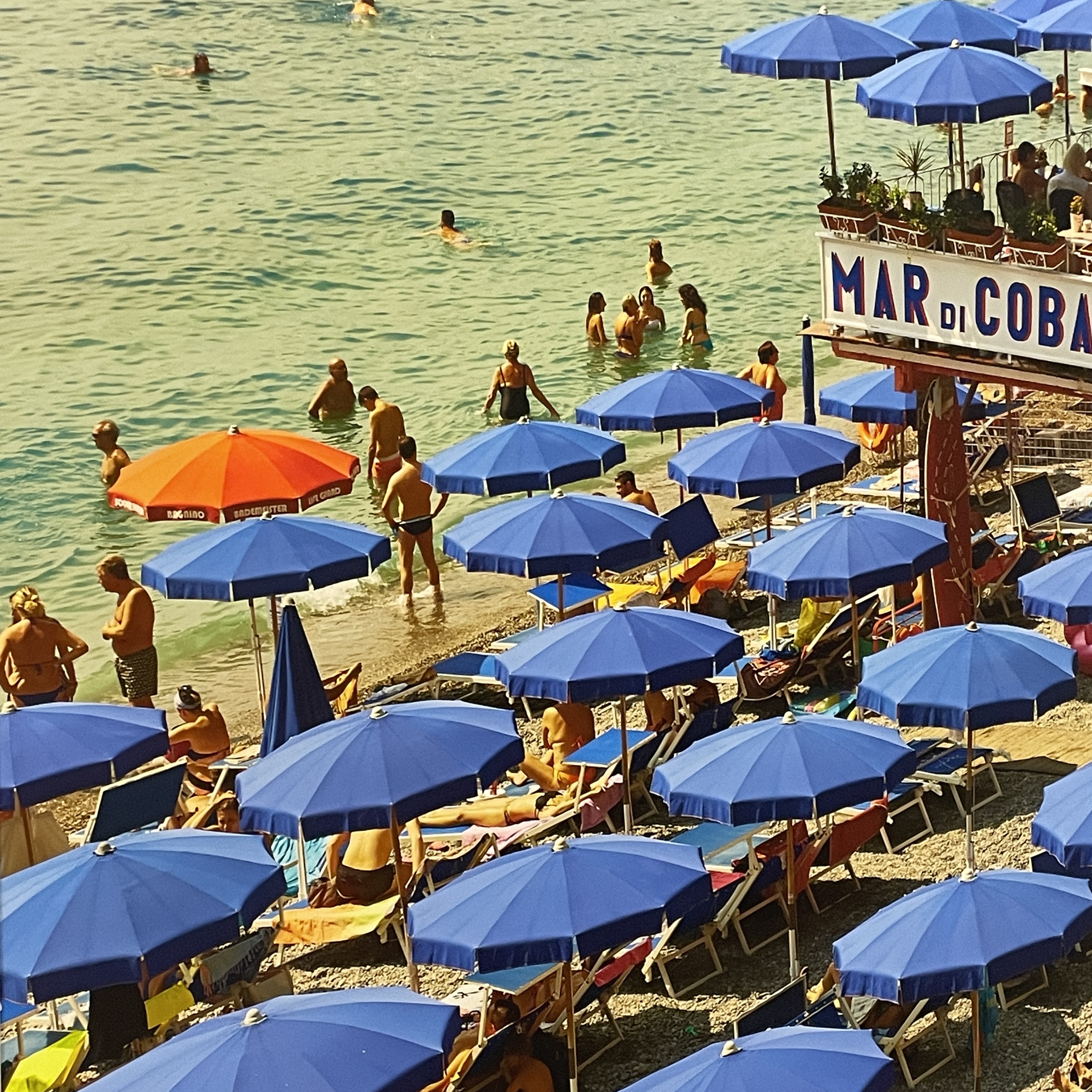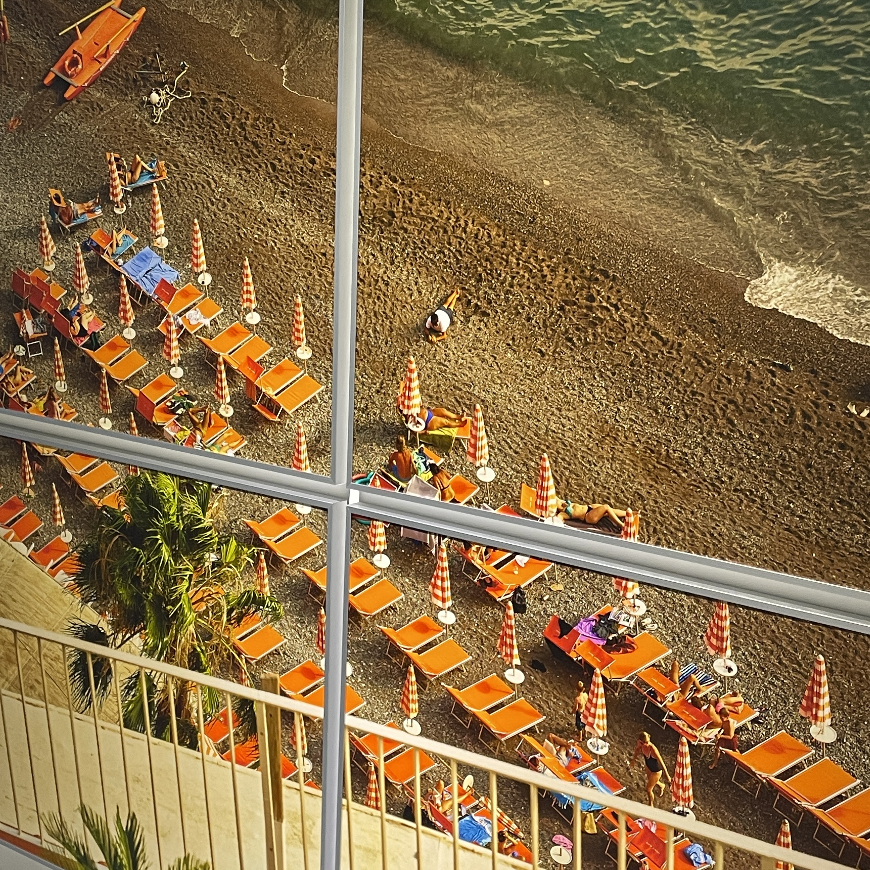 쨍한 오렌지 빛 컬러의 썬베드와 포지타노의 짙은 초록빛 바다색이 어우러진 아름다운 작품이다.