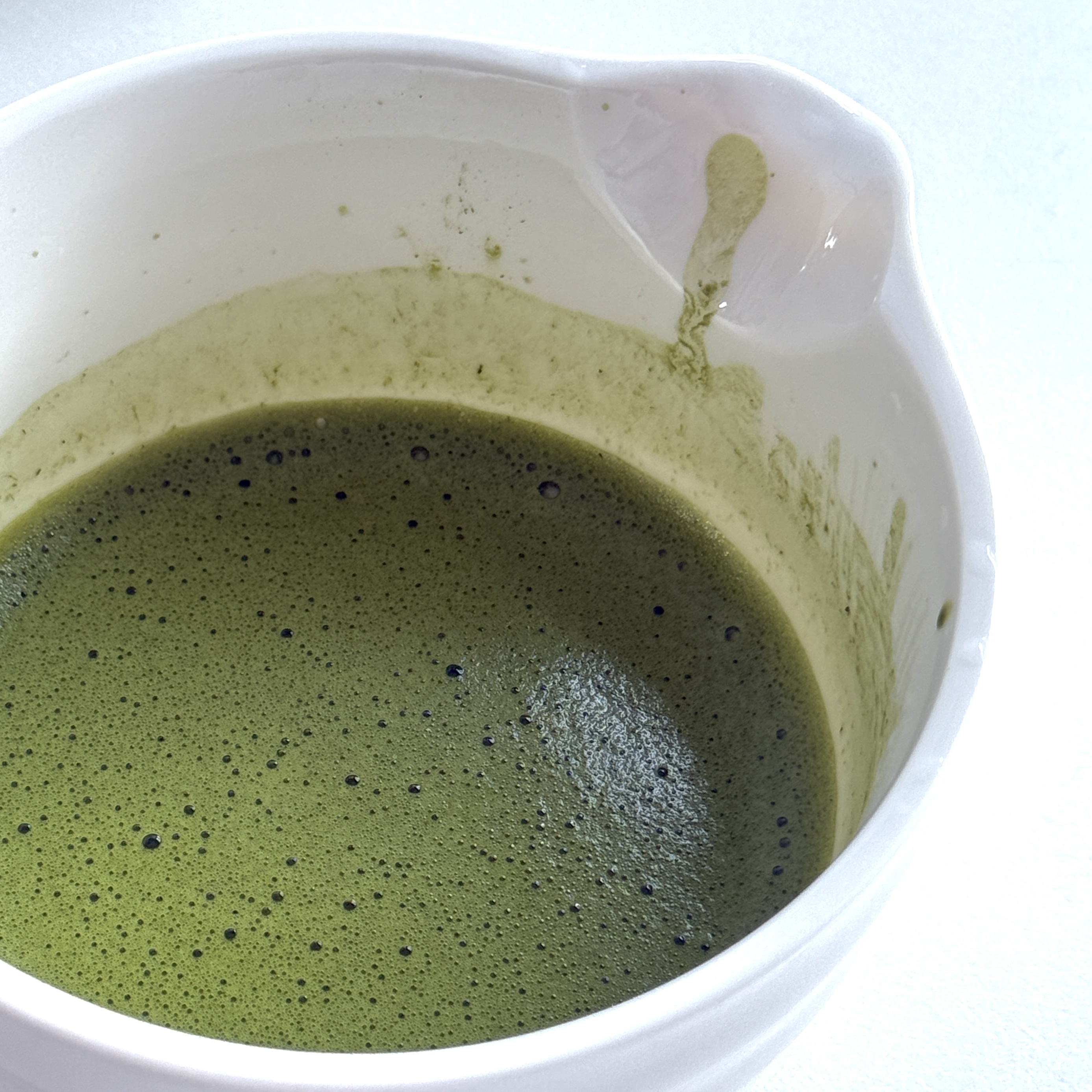 차완에 말차가루를 넣을때 체에 걸러서 입자를 한번 곱게 해주고, 미온수나 뜨거운 물을 넣고 차선을 이용해 W자로 휘핑해주면 부드럽고 거품있는 말차 완성!