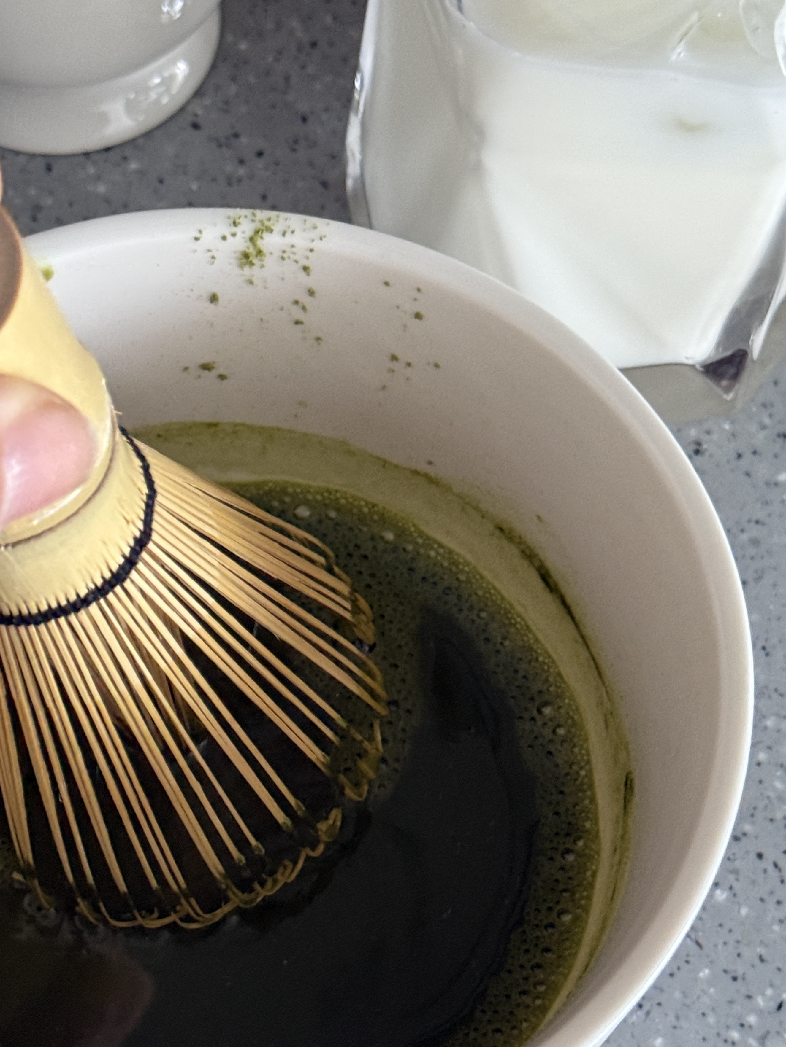 차완에 말차가루를 넣을때 체에 걸러서 입자를 한번 곱게 해주고, 미온수나 뜨거운 물을 넣고 차선을 이용해 W자로 휘핑해주면 부드럽고 거품있는 말차 완성!