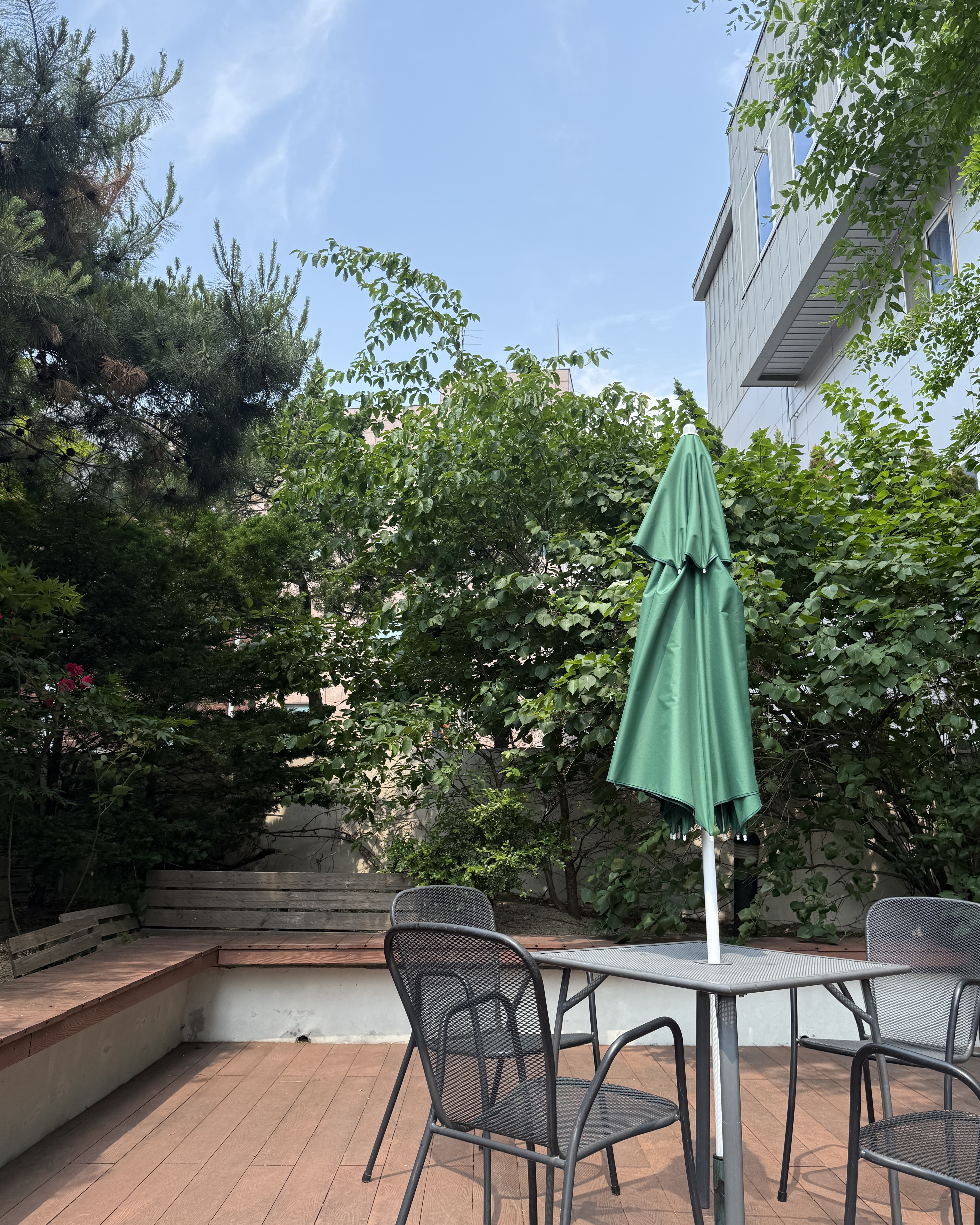 바깥 테라스에는 파라솔 테이블 네개가 있고 그 외에도 앉을 수 있는 자리들이 있다.