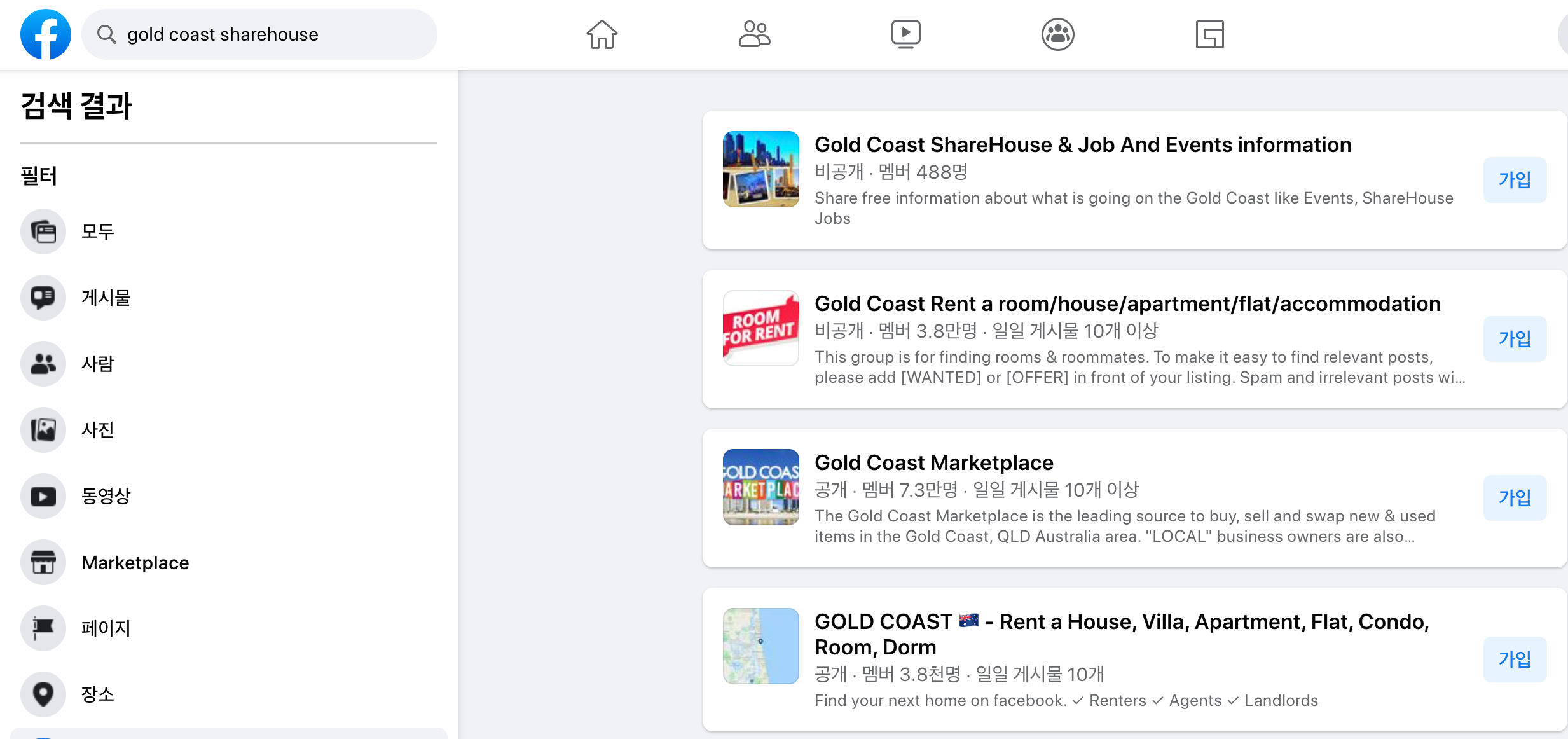 페이스북 그룹에서 쉐어하우스를 구하는 방법은, 검색창에 "지역이름+rent a room", "지역이름+sharehouse" 등의 키워드로 검색하면 여러 가지 그룹이 조회될 것이다. 그 중 회원수가 높고 하루 포스팅이 많은 그룹 2-3개 정도 가입해놓고 각 그룹에 올라온 포스팅을 쭉 확인한다.
