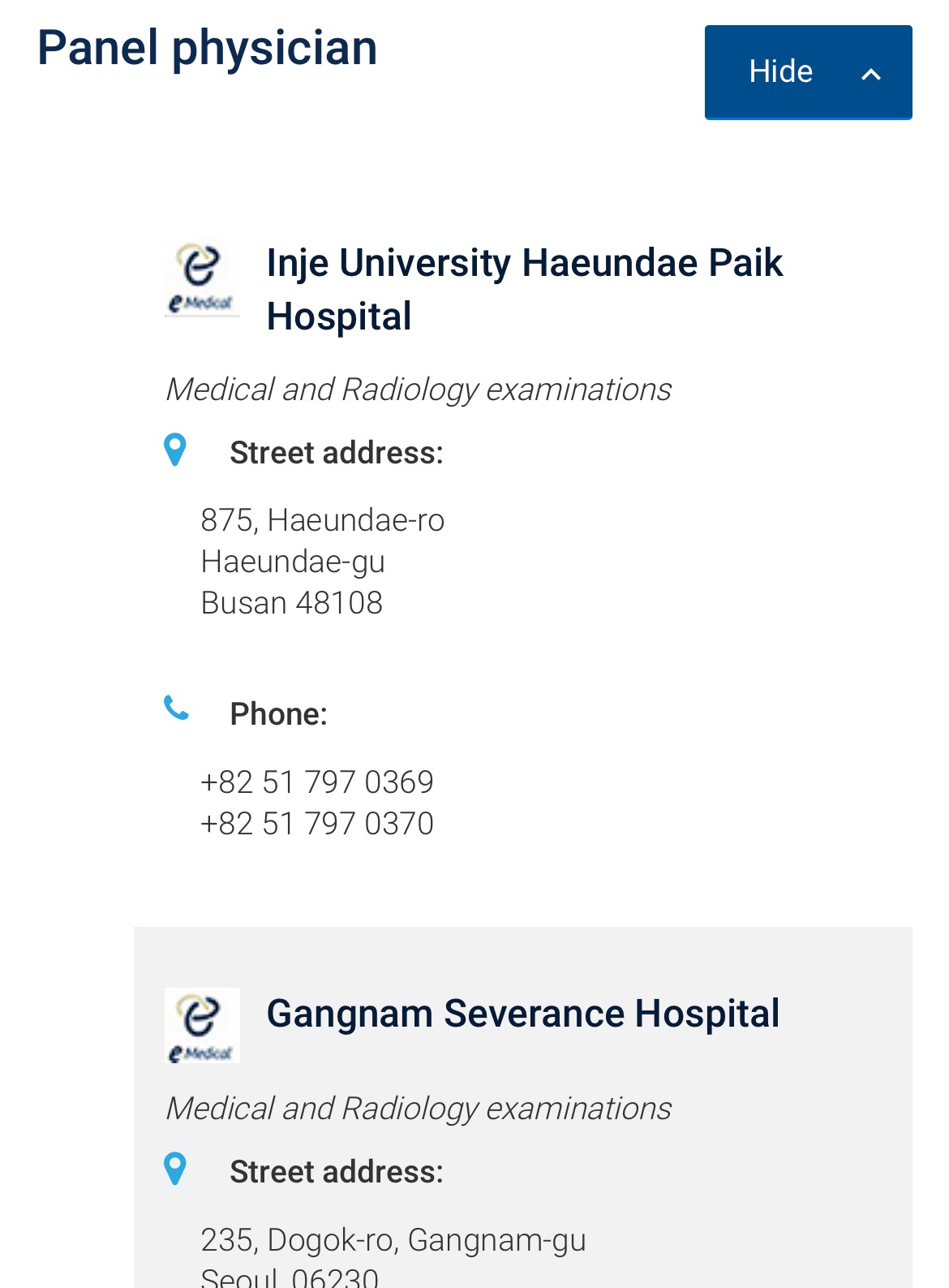스크롤바를 내리면 Panel physician에 호주 이민성의 승인을 받은 한국의 병원 리스트가 나온다.